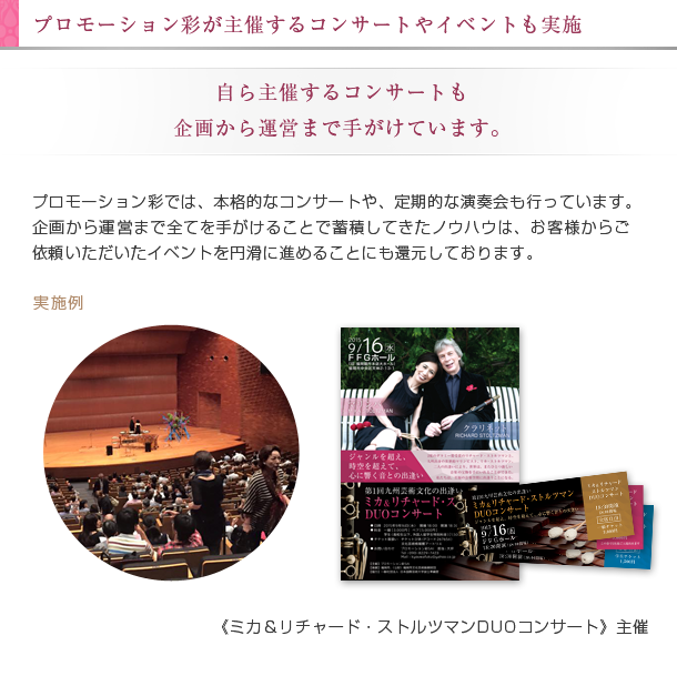 演奏企画・演奏者派遣。ホームパーティから本格的なコンサートまで。様々なジャンルの演奏企画、演奏者派遣に対応します。50人以上登録在籍のプロ集団だから幅広いジャンルをカバーできます。声楽、歌、ピアノ、電子オルガン、オカリナ、弦楽器、管楽器、バンド、ピアノ絵本館、ギター、マリンバ、BGM